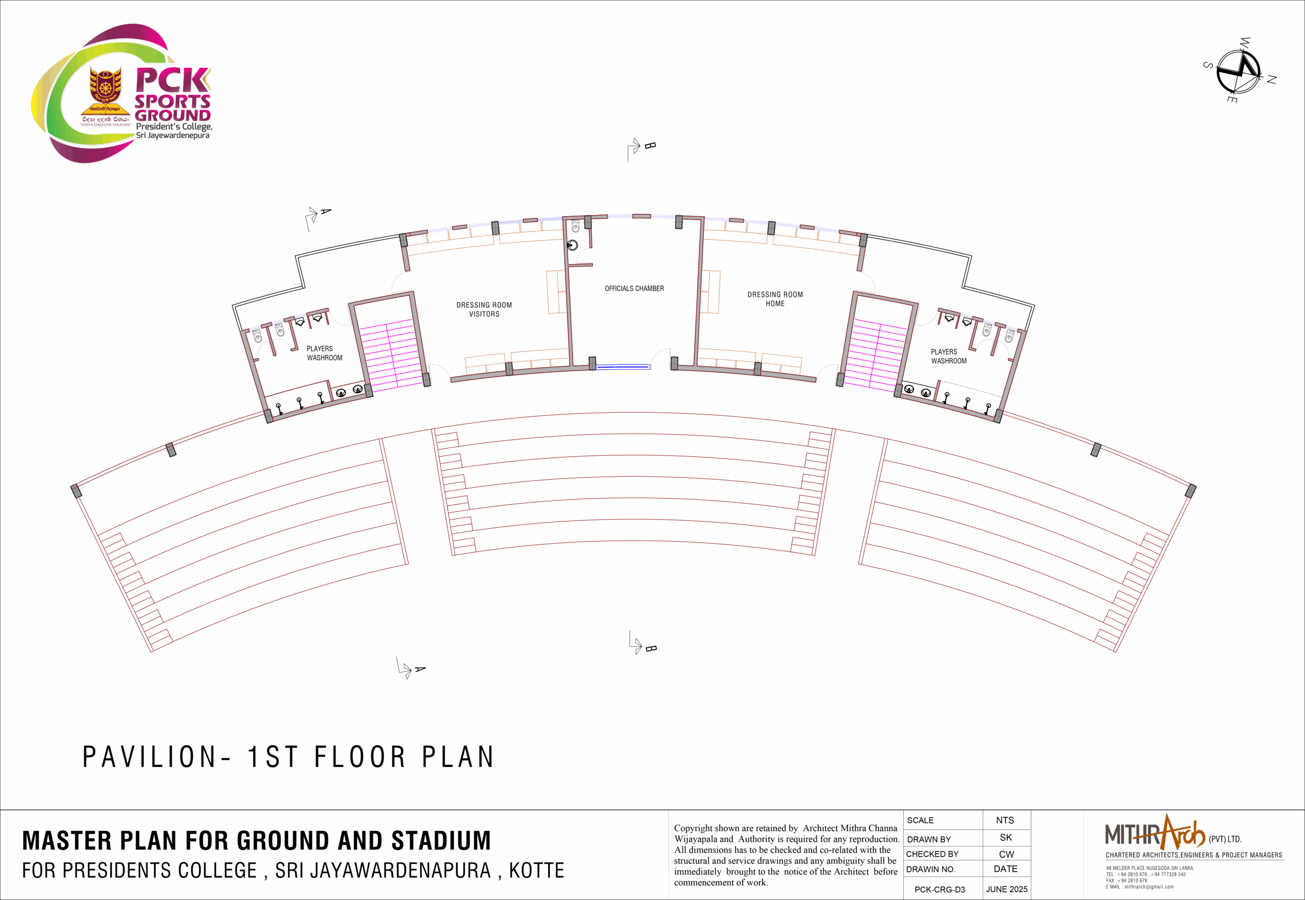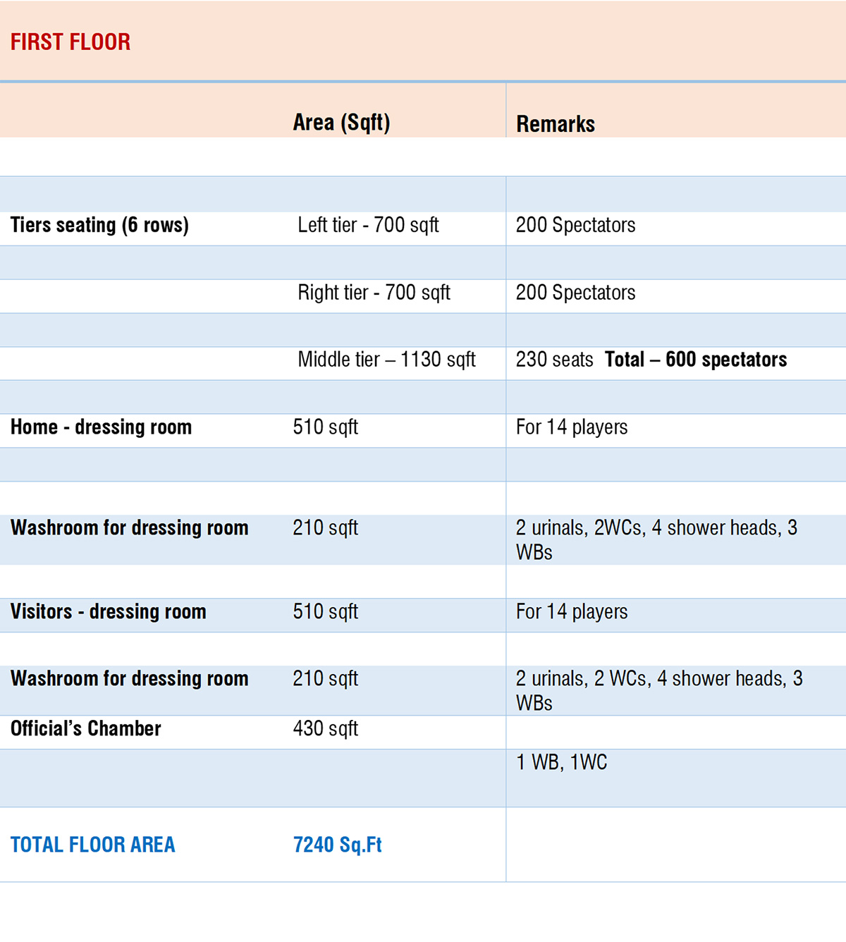The first floor boasts an executive chamber room for administrative functions and two fully-equipped dressing rooms with integrated toilet facilities. Every floor is serviced by separate, well-maintained washroom and toilet facilities, ensuring convenience and hygiene for all users. Built to international sporting standards, this versatile facility seamlessly accommodates both competitive events and training sessions while providing essential amenities for athletes, officials, and spectators. The PCK Ground Development and Pavilion Project represents a significant commitment to promoting athletic excellence and community engagement through world-class sports infrastructure.